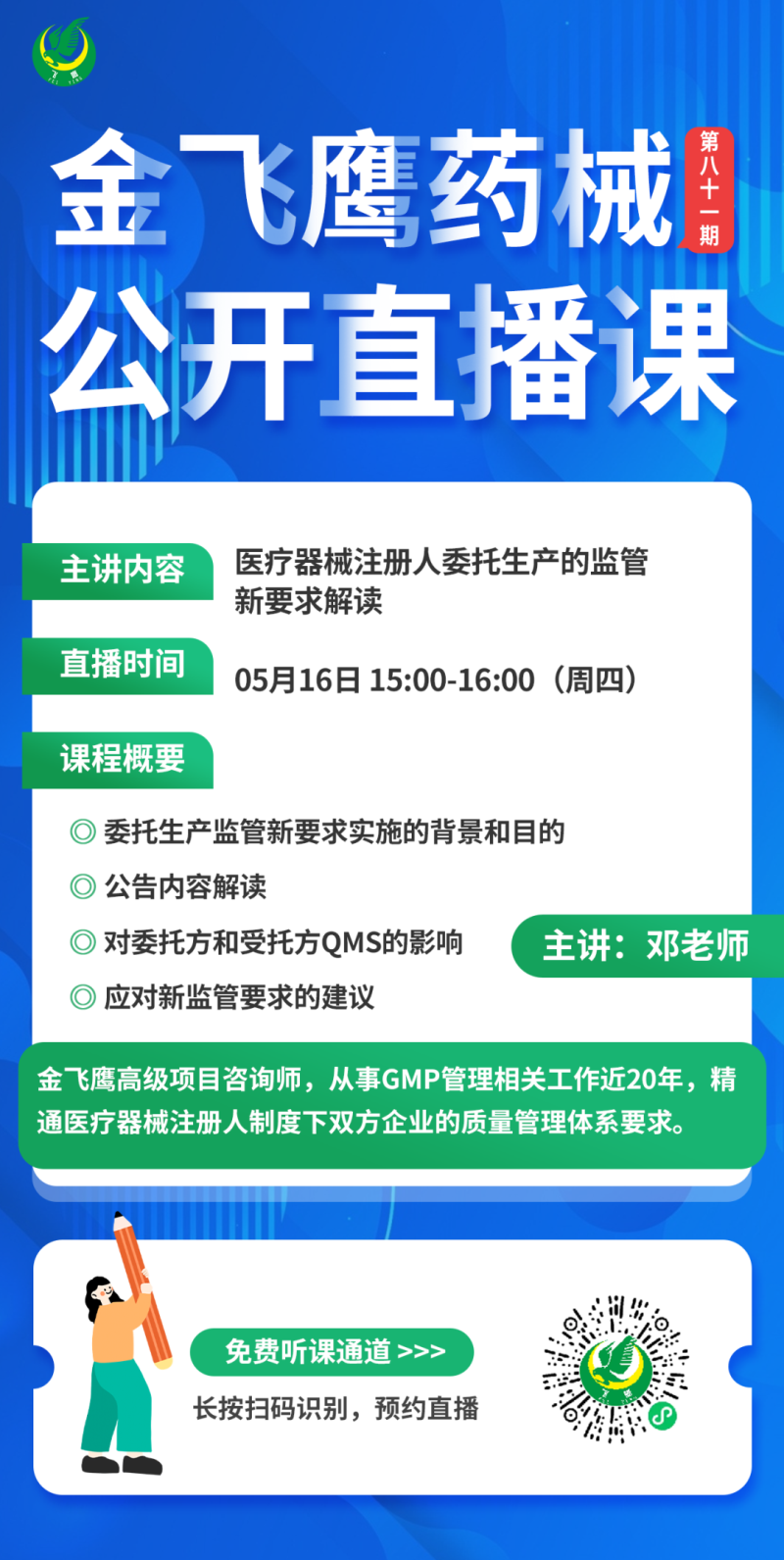 金飛鷹直播培訓(xùn),是每周一次的固定培訓(xùn)欄目,優(yōu)選金飛鷹國內(nèi)外資深注冊/項目老師定期為大家講解醫(yī)療器械注冊相關(guān)知識,解答大家在醫(yī)療器械注冊過程中的諸多疑問。