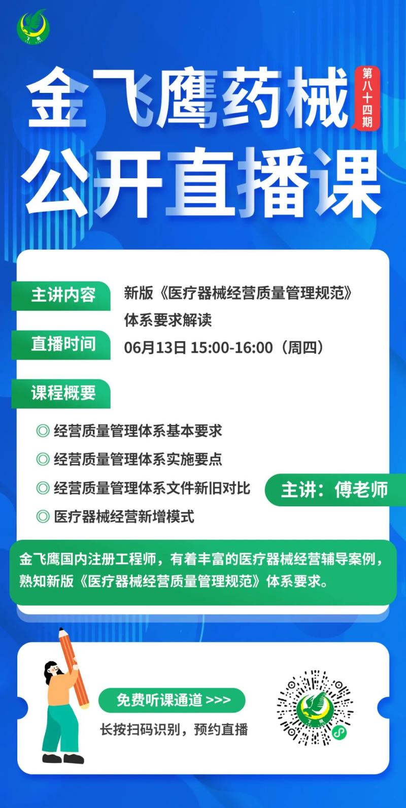 6月13日下午3點,金飛鷹國內(nèi)注冊工程師,有著豐富的醫(yī)療器械經(jīng)營輔導(dǎo)案例,熟知《規(guī)范》體系要求的傅老師,給大家?guī)怼缎掳妗瘁t(yī)療器械經(jīng)營質(zhì)量管理規(guī)范〉體系要求解讀》,培訓(xùn)內(nèi)容包括經(jīng)營質(zhì)量管理體系基本要求、經(jīng)營質(zhì)量管理體系實施要點、經(jīng)營質(zhì)量管理體系文件新舊對比、醫(yī)療器械經(jīng)營新增模式等,醫(yī)療器械經(jīng)營企業(yè)千萬不要錯過了哦!