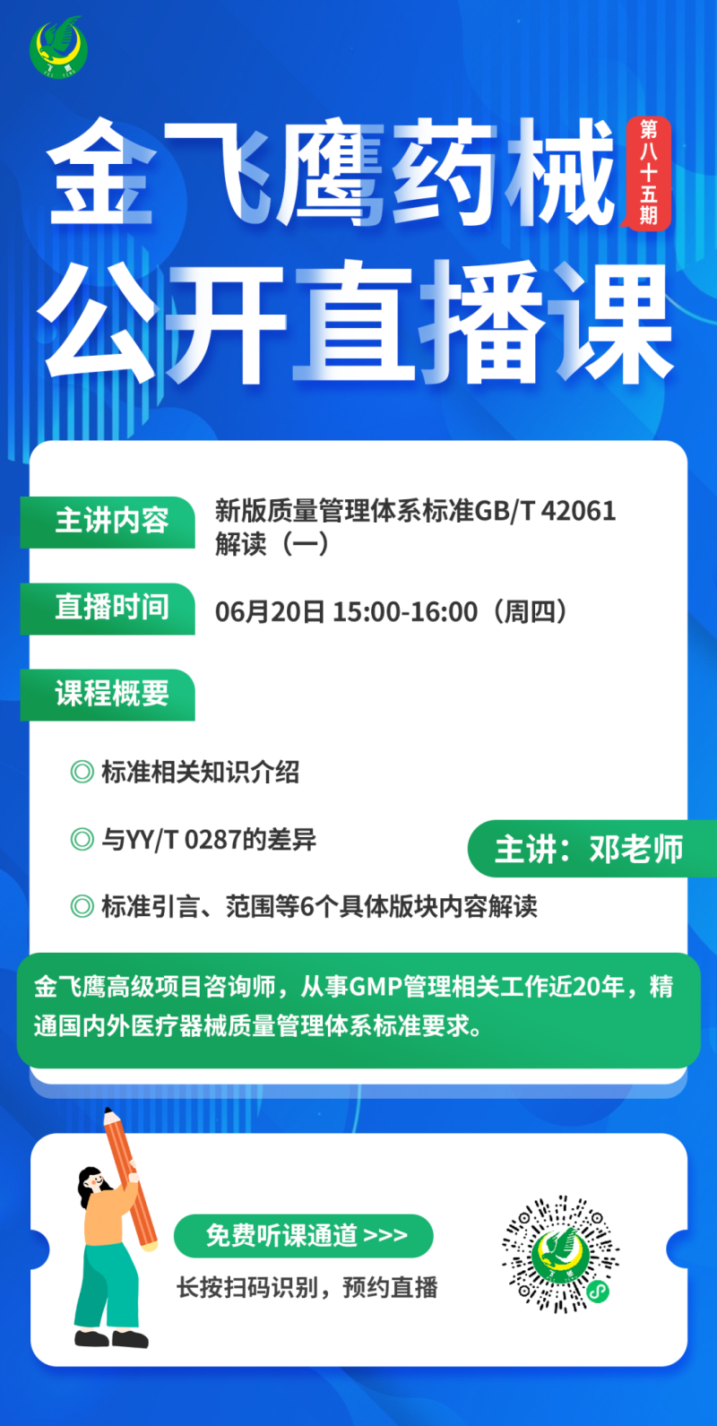 6月20日下午3點,金飛鷹高級項目咨詢師,從事GMP管理相關工作近20年,精通國內(nèi)外醫(yī)療器械質(zhì)量管理體系標準要求的鄧老師,給大家?guī)怼缎掳驷t(yī)療器械質(zhì)量管理體系標準GB/T 42061解讀(一)》,培訓內(nèi)容包括標準相關知識介紹、與YY/T 0287的差異、標準引言/范圍等6個具體版塊內(nèi)容解讀,醫(yī)療器械經(jīng)營企業(yè)千萬不要錯過了哦!