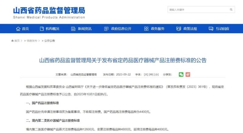 9月22日,山西省藥監(jiān)局官網(wǎng)根據(jù)山西省發(fā)展和改革委員會、山西省財政廳發(fā)布的《關(guān)于進一步降低省定藥品醫(yī)療器械產(chǎn)品注冊費標準的通知》(晉發(fā)改收費發(fā)〔2023〕361號),對省定藥品醫(yī)療器械產(chǎn)品注冊費標準予以公告,自2023年10月1日起執(zhí)行。具體收費標準如下: