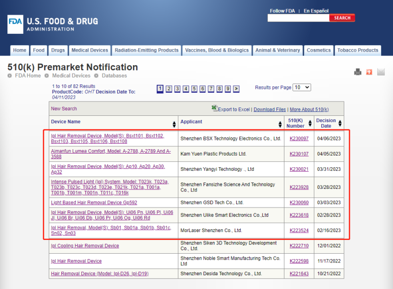 接下來我們照例打開FDA官網(wǎng),按“OHT”代碼檢索并截取了最新數(shù)據(jù)(截至美國時間2023年4月10日),我們可以看到,2023年FDA官網(wǎng)公布的總共有7款I(lǐng)PL脫毛儀產(chǎn)品,這其中有4款產(chǎn)品的K號是由金飛鷹申報的,再加上4月10日新增的暫未在網(wǎng)站顯示的兩個K號,截至目前總共9個脫毛儀K號,6個都是我們做的,占比近70%。