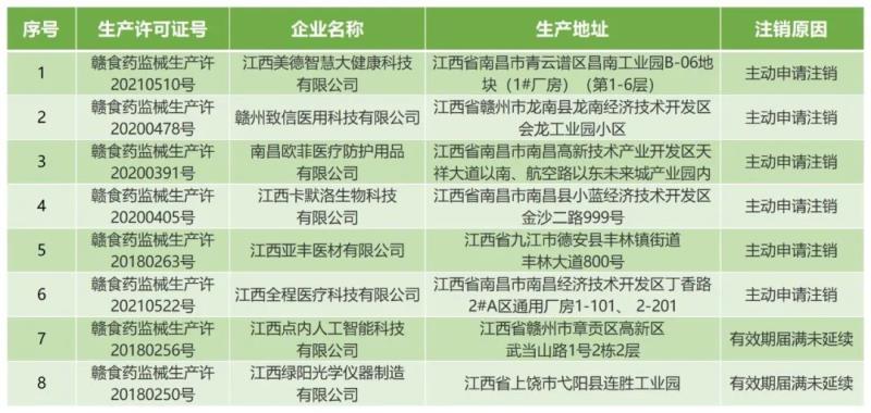 近日,江西省藥監(jiān)局發(fā)布公告稱,注銷江西美德智慧大健康科技有限公司等8家公司的醫(yī)療器械生產(chǎn)許可證,以下為具體明細(xì):