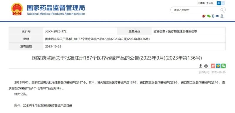 10月26日,國家藥監(jiān)局官網(wǎng)發(fā)布公告稱,2023年9月,國家藥監(jiān)局共批準注冊醫(yī)療器械產(chǎn)品187個。其中,境內第三類醫(yī)療器械產(chǎn)品137個,進口第三類醫(yī)療器械產(chǎn)品25個,進口第二類醫(yī)療器械產(chǎn)品24個,港澳臺醫(yī)療器械產(chǎn)品1個。