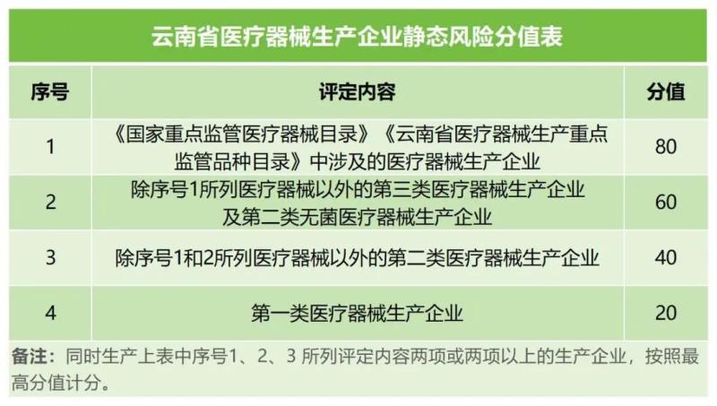 10月26日,云南省藥監(jiān)局官網(wǎng)發(fā)布《云南省醫(yī)療器械生產(chǎn)風(fēng)險(xiǎn)分級(jí)監(jiān)管實(shí)施細(xì)則(試行)》(以下簡(jiǎn)稱《實(shí)施細(xì)則》),其中指出設(shè)定醫(yī)療器械生產(chǎn)企業(yè)靜態(tài)風(fēng)險(xiǎn)和動(dòng)態(tài)風(fēng)險(xiǎn)評(píng)價(jià)指標(biāo)及分值,根據(jù)計(jì)分結(jié)果確定醫(yī)療器械生產(chǎn)企業(yè)風(fēng)險(xiǎn)等級(jí)。