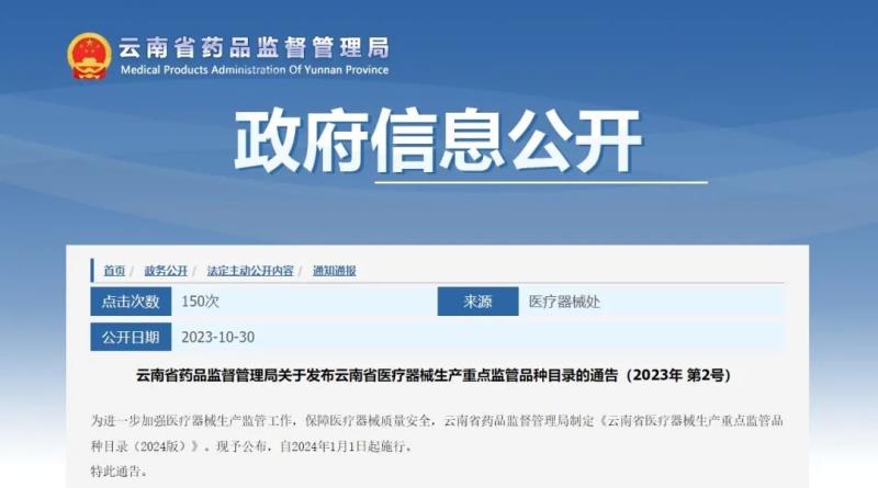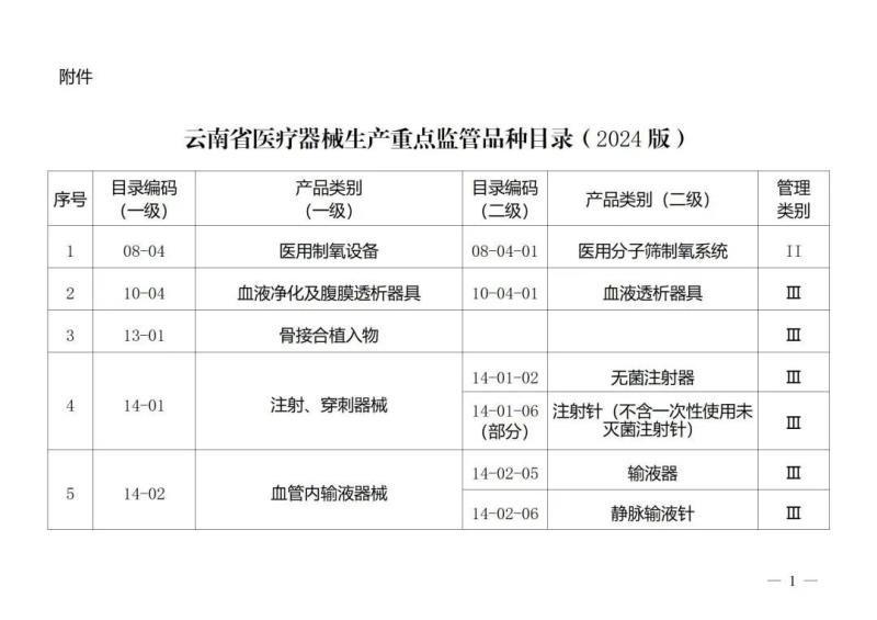 10月30日,云南省藥監(jiān)局官網(wǎng)公布《云南省醫(yī)療器械生產(chǎn)重點(diǎn)監(jiān)管品種目錄(2024版)》(以下簡(jiǎn)稱(chēng)《目錄》),其中包括醫(yī)用分子篩制氧系統(tǒng)、創(chuàng)面敷貼等7種Ⅱ類(lèi)產(chǎn)品及血液透析器具、無(wú)菌注射器等9種Ⅲ類(lèi)產(chǎn)品。《目錄》自2024年1月1日起施行,以下為具體清單: