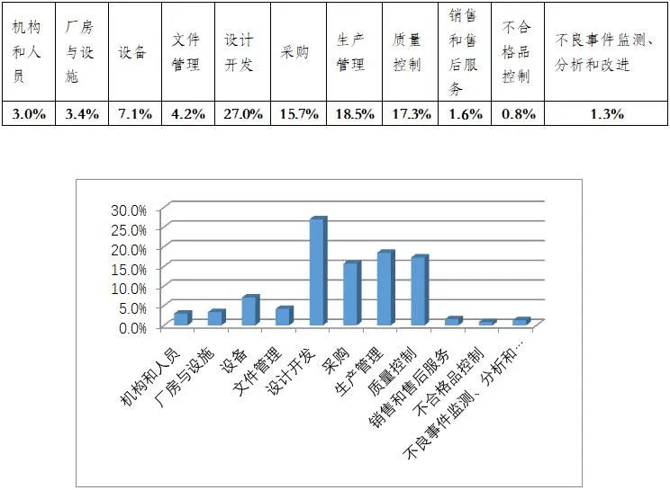 從各章節(jié)不符合項總數(shù)占比來看,占據(jù)前四位的分別為設(shè)計開發(fā)(27%)、生產(chǎn)管理(18.5%)、質(zhì)量管理(17.3%)和采購(15.7%)。
