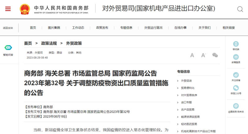 近日,國家商務(wù)部官網(wǎng)發(fā)布《關(guān)于調(diào)整防疫物資出口質(zhì)量監(jiān)管措施的公告》,就非醫(yī)用口罩、新型冠狀病毒檢測試劑、醫(yī)用口罩、醫(yī)用防護服、呼吸機、紅外體溫計六大類防疫物資產(chǎn)品出口質(zhì)量監(jiān)管措施作出如下調(diào)整: