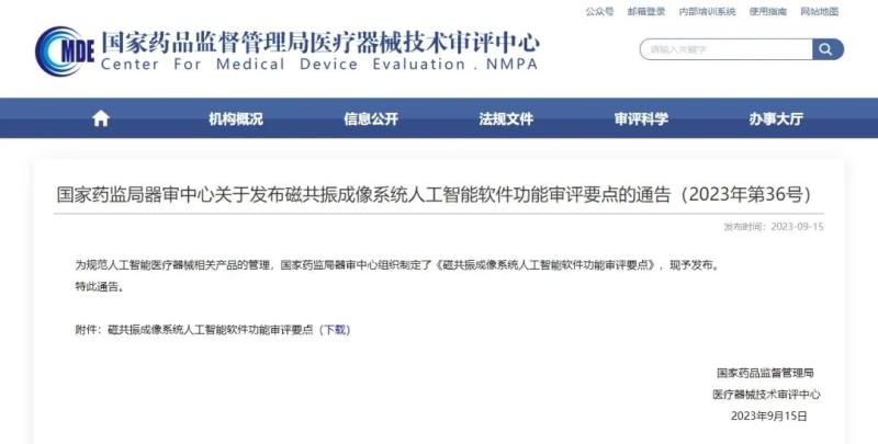 近日,國(guó)家藥監(jiān)局器審中心官網(wǎng)發(fā)布《磁共振成像系統(tǒng)人工智能軟件功能審評(píng)要點(diǎn)》(以下簡(jiǎn)稱《審評(píng)要點(diǎn)》),我們將其中重點(diǎn)內(nèi)容摘錄如下: