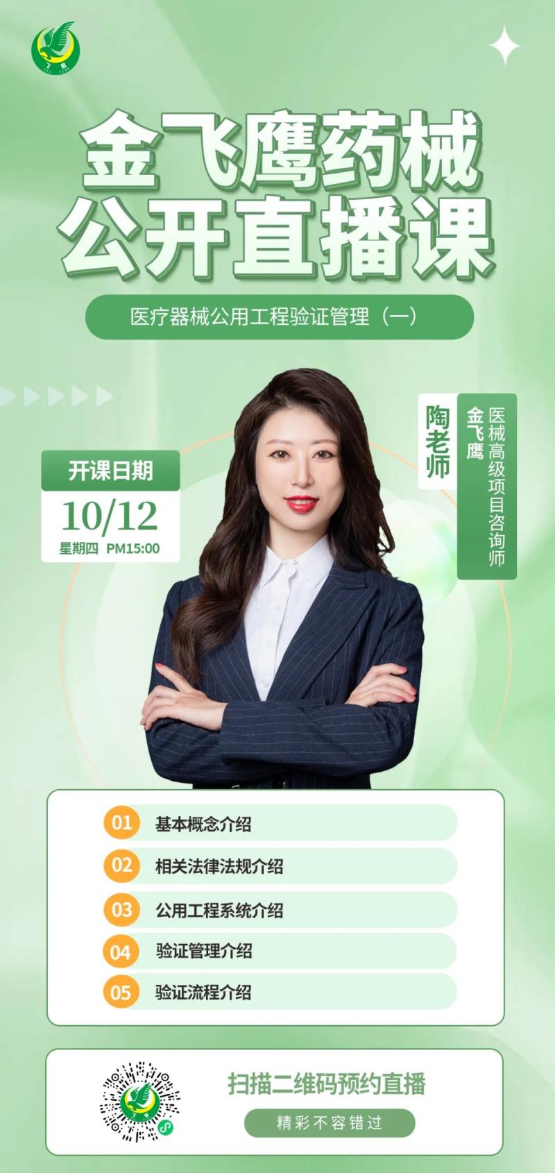 10月12日下午3點(diǎn),金飛鷹高級項(xiàng)目咨詢師,有著15年工廠管理、7年質(zhì)量經(jīng)理及廠長經(jīng)驗(yàn),曾主導(dǎo)多個(gè)Ⅱ類&Ⅲ類醫(yī)療器械廠房項(xiàng)目建設(shè)的陶老師,給大家?guī)怼夺t(yī)療器械公用工程驗(yàn)證管理(一)》,培訓(xùn)內(nèi)容包括基本概念介紹、相關(guān)法律法規(guī)介紹、公用工程系統(tǒng)介紹、驗(yàn)證管理介紹、驗(yàn)證流程介紹等,大家千萬不要錯(cuò)過了哦!