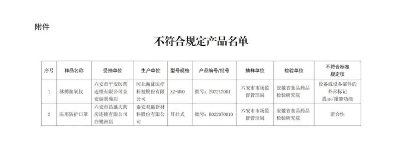 (一)脈搏血氧儀1批:標(biāo)示為河北循證醫(yī)療科技股份有限公司生產(chǎn),設(shè)備或設(shè)備部件的外部標(biāo)記 提示/報警功能不符合標(biāo)準(zhǔn)規(guī)定。 (二)醫(yī)用防護口罩1批:標(biāo)示為泰安雙贏新材料股份有限公司生產(chǎn),密合性不符合標(biāo)準(zhǔn)規(guī)定。