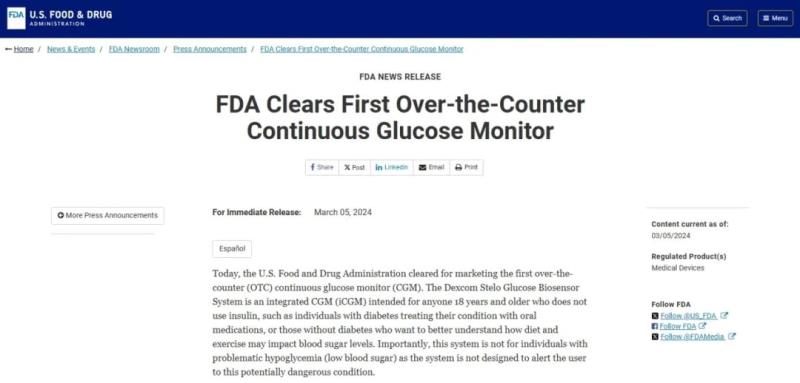 近日,F(xiàn)DA批準銷售首款非處方(OTC)連續(xù)血糖監(jiān)測儀(CGM)。這款Stelo Glucose Biosensor System,是一種集成的CGM (iCGM),適用于18歲及以上不使用胰島素的任何人,例如使用口服藥物治療病情的糖尿病患者,或希望更好地了解飲食和運動如何影響血糖水平的非糖尿病患者。值得注意的是,這個系統(tǒng)不適用于有嚴重低血糖問題的個體,因為該系統(tǒng)并未設計來提醒用戶這種潛在的危險狀況。