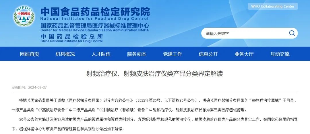 2022年3月,國(guó)家藥監(jiān)局發(fā)布《關(guān)于調(diào)整〈醫(yī)療器械分類目錄〉部分內(nèi)容的公告(2022年第30號(hào))》(以下簡(jiǎn)稱“30號(hào)公告”),明確《醫(yī)療器械分類目錄》“09物理治療器械”子目錄、一級(jí)產(chǎn)品類別“07高頻治療設(shè)備”中二級(jí)產(chǎn)品類別“02射頻治療(非消融)設(shè)備”中射頻治療儀、射頻皮膚治療儀作為第三類醫(yī)療器械管理。同時(shí)指出,自2024年4月1日起,射頻治療儀、射頻皮膚治療儀類產(chǎn)品未依法取得醫(yī)療器械注冊(cè)證不得生產(chǎn)、進(jìn)口和銷售。