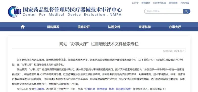 4月11日,國家藥監(jiān)局器審中心發(fā)布公告稱,對網(wǎng)站欄目設(shè)置進(jìn)行了調(diào)整,在“辦事大廳”欄目增設(shè)技術(shù)文件檢索專欄。