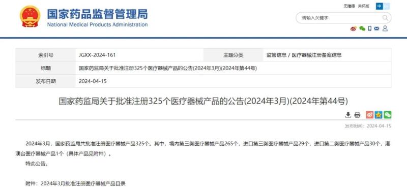 4月15日,國家藥監(jiān)局官網(wǎng)發(fā)布公告稱,2024年3月,國家藥監(jiān)局共批準注冊醫(yī)療器械產(chǎn)品325個。其中,境內第三類醫(yī)療器械產(chǎn)品265個,進口第三類醫(yī)療器械產(chǎn)品29個,進口第二類醫(yī)療器械產(chǎn)品30個,港澳臺醫(yī)療器械產(chǎn)品1個。