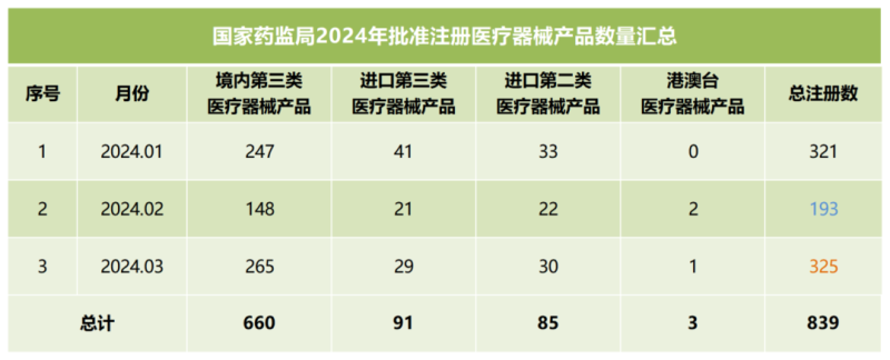 我們同步匯總了2024年第一季度國家藥監(jiān)局批準注冊的醫(yī)療器械產(chǎn)品數(shù)量(見下方表格),從表格中可以看出,截至3月,2024年國家藥監(jiān)局總計批準注冊醫(yī)療器械產(chǎn)品839個,其中境內第三類醫(yī)療器械產(chǎn)品660個,進口第三類醫(yī)療器械產(chǎn)品91個,進口第二類醫(yī)療器械產(chǎn)品85個,港澳臺醫(yī)療器械產(chǎn)品3個。