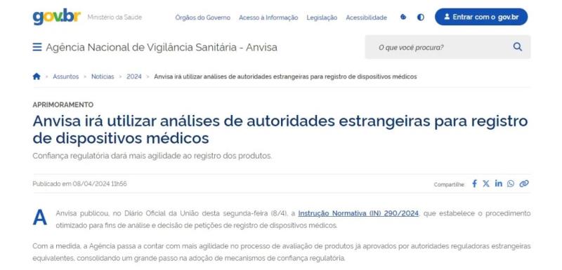近日,Anvisa發(fā)布第290/2024號規(guī)范性指令,規(guī)定了審核和決定醫(yī)療器械注冊申請的簡化程序:經(jīng)認可的海外監(jiān)管機構(gòu)(澳洲、加拿大、美國、日本)授權(quán)上市的Class Ⅲ、Class Ⅳ類高風(fēng)險醫(yī)療器械,可根據(jù)公司的申請縮短其在巴西注冊的審核時間。此簡化程序的申請需提交相關(guān)文件,以證明進入巴西市場的產(chǎn)品與經(jīng)認可的監(jiān)管機構(gòu)批準(zhǔn)的產(chǎn)品有著相同的生產(chǎn)特征、適應(yīng)癥和預(yù)期用途。