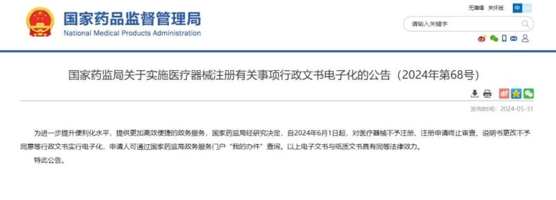 近日,國家藥監(jiān)局發(fā)布公告稱,自2024年6月1日起,對醫(yī)療器械不予注冊、注冊申請終止審查、說明書更改不予同意等行政文書實行電子化,申請人可通過國家藥監(jiān)局政務服務門戶“我的辦件”查詢。以上電子文書與紙質文書具有同等法律效力。
