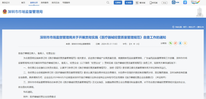 一、各經營企業(yè)應強化主體責任落實,認真學習新修訂的《規(guī)范》,按照《規(guī)范》要求建立健全質量管理體系并保證其有效運行。 二、各經營企業(yè)應根據(jù)新修訂的《規(guī)范》要求認真開展自查并報送自查情況,對自查中發(fā)現(xiàn)的問題應制定整改計劃,落實整改措施,及時消除各種質量安全隱患。具體填報方式:企業(yè)應在2024年6月25日前登錄深圳市醫(yī)療器械行業(yè)協(xié)會官網企業(yè)年檢專欄在線填報《醫(yī)療器械經營企業(yè)自查要點》(詳見附件)。 三、深圳市市場監(jiān)督管理局將在新修訂的《規(guī)范》正式實施后,加強抽查經營企業(yè)自查情況和監(jiān)督檢查,對不符合醫(yī)療器械經營管理相關規(guī)定的企業(yè),依法查處和清理。