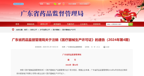 近日,廣東藥監(jiān)局發(fā)布通告稱,根據(jù)企業(yè)申請,該局于2024年4月依法注銷了深圳市度彼電子有限公司、深圳市倍斯特科技股份有限公司、比亞迪通信信號有限公司、深圳理邦實(shí)驗(yàn)生物電子有限公司等30家企業(yè)的《醫(yī)療器械生產(chǎn)許可證》。具體清單如下: