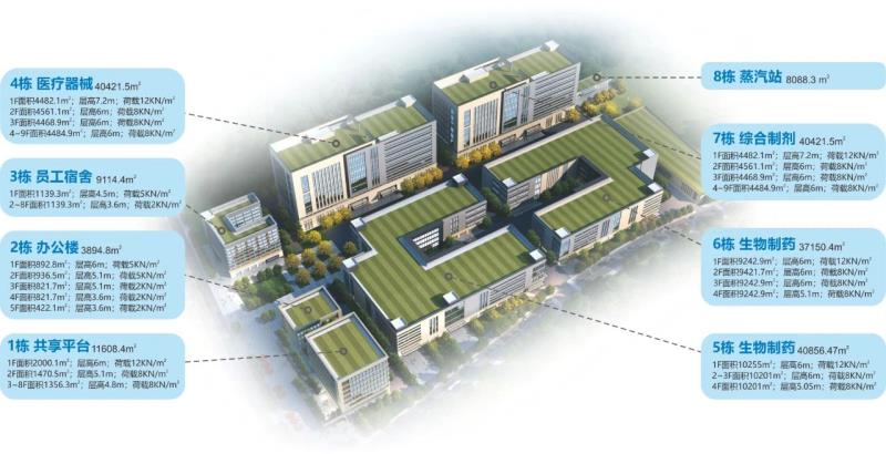 三醫(yī)智造中心一期為工業(yè)載體,總占地123畝,總建筑面積25萬㎡,其中產(chǎn)業(yè)建筑面積18.3萬㎡,建設(shè)高承重、高層高標(biāo)準(zhǔn)廠房,配置雙回路供電、蒸汽站、污水處理站、?;瘞臁⒌拱喾康仍O(shè)施。層高4.8-7.2m,承重0.8-1.2噸,面積單層最大可達1萬㎡。主要引入綜合制劑、生物技術(shù)藥、醫(yī)療器械、細胞治療、綠色食品、電子信息等項目的中試與生產(chǎn)。