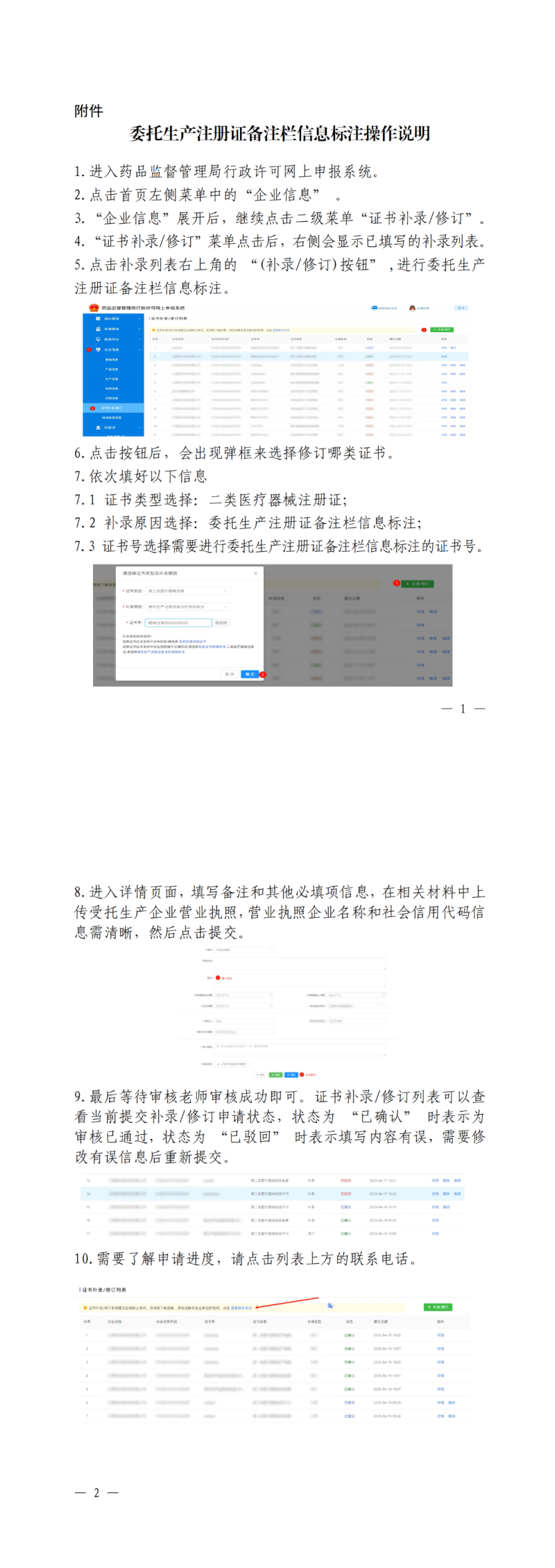 一、自2024年6月1日起,涉及境內(nèi)委托生產(chǎn)的注冊申請或者延續(xù)注冊申請,省局將在醫(yī)療器械注冊證生產(chǎn)地址欄中登載受托生產(chǎn)地址并注明“(委托生產(chǎn))”,同時在備注欄備注受托生產(chǎn)企業(yè)名稱和統(tǒng)一社會信用代碼,備注形式為“受托生產(chǎn)企業(yè):XXXX公司;統(tǒng)一社會信用代碼:XXXX”。變更注冊涉及注冊人委托生產(chǎn)的,也將在變更注冊文件中按照上述方式注明委托生產(chǎn)相關(guān)信息,并將變更信息在注冊證書生產(chǎn)地址和備注相應(yīng)字段中更新。 二、僅受托生產(chǎn)企業(yè)名稱文字性變化的,無需申請變更備案,在延續(xù)注冊時,核發(fā)修改后的注冊證。 三、對省內(nèi)已核發(fā)的涉及境內(nèi)委托生產(chǎn)的注冊證,若未按照上述要求標注相關(guān)信息,注冊人可按照附件操作說明申請標注,相關(guān)工作應(yīng)在8月31日前完成。 四、注冊人不再進行委托生產(chǎn)的,應(yīng)當及時向省局核減受托生產(chǎn)地址;受托生產(chǎn)企業(yè)應(yīng)當及時向所在地省級藥品監(jiān)督管理部門報告有關(guān)情況。 五、注冊人在申請標注過程中存在疑問的,可與省局相關(guān)部門聯(lián)系。醫(yī)療器械注冊管理處,0791-88158031;系統(tǒng)運維工程師,0791-88125223(吳工)、0791-86507350(涂工)。