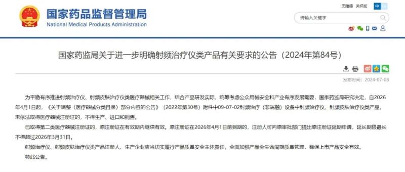 為平穩(wěn)有序推進射頻治療儀、射頻皮膚治療儀類醫(yī)療器械相關(guān)工作,結(jié)合產(chǎn)品研發(fā)實際,統(tǒng)籌考慮公眾用械安全和產(chǎn)業(yè)有序發(fā)展需要,國家藥監(jiān)局研究決定,自2026年4月1日起,《關(guān)于調(diào)整〈醫(yī)療器械分類目錄〉部分內(nèi)容的公告》(2022年第30號)附件中09-07-02射頻治療(非消融)設(shè)備中射頻治療儀、射頻皮膚治療儀類產(chǎn)品,未依法取得醫(yī)療器械注冊證的,不得生產(chǎn)、進口和銷售。