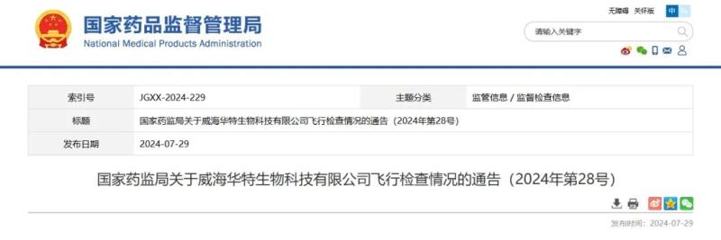 7月29日,國(guó)家藥監(jiān)局發(fā)布通告稱,該局組織檢查組對(duì)威海**生物科技有限公司進(jìn)行飛行檢查,發(fā)現(xiàn)該企業(yè)質(zhì)量管理體系主要存在以下缺陷: