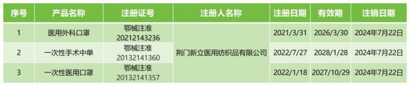 近日,湖北省藥監(jiān)局發(fā)布了幾則注銷公告,其中提到,由于荊門新立醫(yī)用紡織品有限公司主動申請注銷其持有的幾張注冊證(含醫(yī)用外科口罩、一次性手術(shù)中單等產(chǎn)品),根據(jù)《醫(yī)療器械注冊與備案管理辦法》第六十三條規(guī)定,準(zhǔn)予注銷并公布,具體明細(xì)如下: