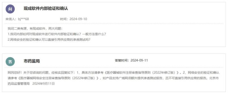 根據(jù)北京市藥監(jiān)局的答復(fù),軟件驗證和確認具體方法可參考《醫(yī)療器械軟件注冊審查指導(dǎo)原則(2022年修訂版)》;網(wǎng)絡(luò)安全的驗證和確認則可參考《醫(yī)療器械網(wǎng)絡(luò)安全注冊審查指導(dǎo)原則(2022年修訂版)》,如產(chǎn)品支持廣域網(wǎng),需額外提供滲透測試報告,且不可直接引用供應(yīng)商的報告。