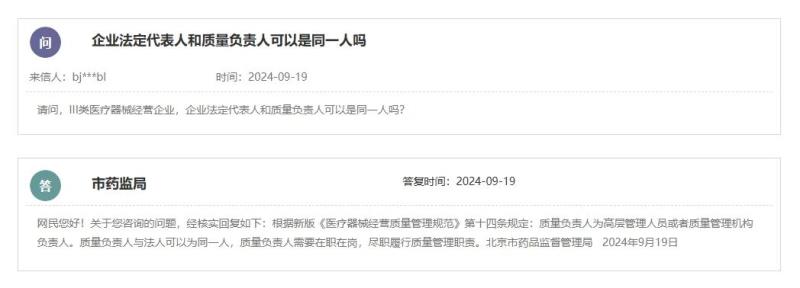 根據(jù)北京市藥監(jiān)局的答復(fù),新版《醫(yī)療器械經(jīng)營質(zhì)量管理規(guī)范》第十四條規(guī)定:質(zhì)量負(fù)責(zé)人為高層管理人員或者質(zhì)量管理機(jī)構(gòu)負(fù)責(zé)人。質(zhì)量負(fù)責(zé)人與法人可以為同一人,質(zhì)量負(fù)責(zé)人需要在職在崗,盡職履行質(zhì)量管理職責(zé)。