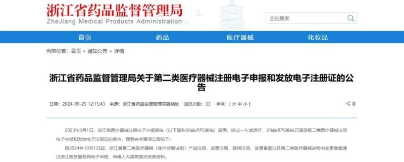9月25日,浙江省藥監(jiān)局發(fā)布《關于第二類醫(yī)療器械注冊電子申報和發(fā)放電子注冊證的公告》,具體事項如下: