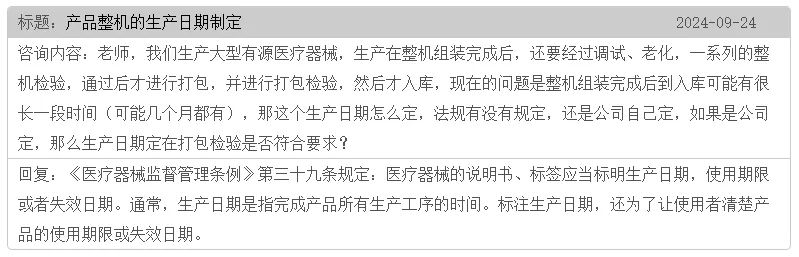 根據(jù)國家藥監(jiān)局食品藥品審核查驗中心的答復(fù),《醫(yī)療器械監(jiān)督管理條例》第三十九條規(guī)定:醫(yī)療器械的說明書、標(biāo)簽應(yīng)當(dāng)標(biāo)明生產(chǎn)日期,使用期限或者失效日期。通常,生產(chǎn)日期是指完成產(chǎn)品所有生產(chǎn)工序的時間。標(biāo)注生產(chǎn)日期,還為了讓使用者清楚產(chǎn)品的使用期限或失效日期。