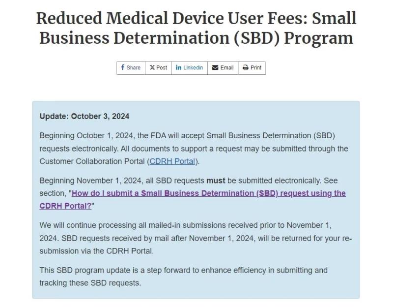 公告提到,從2024年10月1日開始,F(xiàn)DA將接受電子形式的小企業(yè)認定(SBD)請求。支持請求的所有文件都可以通過Customer Collaboration Portal(CDRH Portal) 提交。