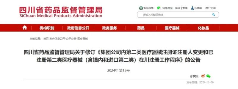 近日,四川省藥監(jiān)局發(fā)布了新版《集團公司內(nèi)第二類醫(yī)療器械注冊證注冊人變更和已注冊第二類醫(yī)療器械(含境內(nèi)和進口第二類)在川注冊工作程序》,具體內(nèi)容如下: