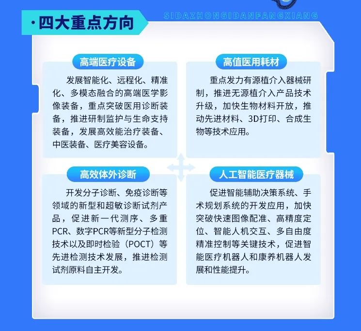《行動(dòng)計(jì)劃》共提出了四大重點(diǎn)方向、六個(gè)重大工程、八大保障措施,按照“融合創(chuàng)新、醫(yī)產(chǎn)協(xié)同、聯(lián)動(dòng)發(fā)展、開放合作”的基本原則,圍繞產(chǎn)業(yè)規(guī)模、創(chuàng)新效益、企業(yè)實(shí)力、產(chǎn)業(yè)生態(tài)四個(gè)維度,提出到2026年總體規(guī)模突破500億元、打造專業(yè)化產(chǎn)業(yè)園區(qū)5個(gè)以上、創(chuàng)新品種累計(jì)突破100個(gè)、力爭(zhēng)培育億元級(jí)新產(chǎn)品10個(gè)以上、新增一批國家級(jí)或市級(jí)創(chuàng)新載體、支持建設(shè)一批創(chuàng)新醫(yī)療器械示范應(yīng)用中心、培訓(xùn)中心、產(chǎn)教融合基地等具體目標(biāo),力爭(zhēng)到“十五五”末建成對(duì)標(biāo)世界一流水平的高端創(chuàng)新醫(yī)療器械產(chǎn)業(yè)集群。
