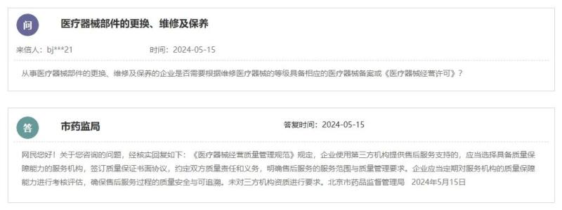 根據(jù)北京市藥監(jiān)局的答復(fù),《醫(yī)療器械經(jīng)營(yíng)質(zhì)量管理規(guī)范》規(guī)定,企業(yè)使用第三方機(jī)構(gòu)提供售后服務(wù)支持的,應(yīng)當(dāng)選擇具備質(zhì)量保障能力的服務(wù)機(jī)構(gòu),簽訂質(zhì)量保證書(shū)面協(xié)議,約定雙方質(zhì)量責(zé)任和義務(wù),明確售后服務(wù)的服務(wù)范圍與質(zhì)量管理要求。企業(yè)應(yīng)當(dāng)定期對(duì)服務(wù)機(jī)構(gòu)的質(zhì)量保障能力進(jìn)行考核評(píng)估,確保售后服務(wù)過(guò)程的質(zhì)量安全與可追溯。未對(duì)三方機(jī)構(gòu)資質(zhì)進(jìn)行要求。