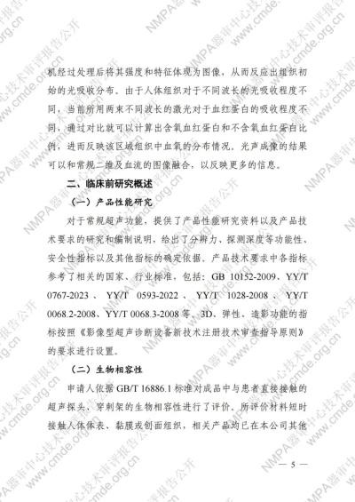 產(chǎn)品利用超聲回波及多普勒等原理,實現(xiàn)對人體組織的超聲成像。產(chǎn)品具有多種不同的成像模式和后處理功能,不涉及深度學習算法??蛇x配不同型號的探頭以及穿刺架、耦合劑加熱器等不同部件。 除常規(guī)超聲功能外,本產(chǎn)品還具有光聲成像功能,在線陣探頭的基礎上增加同步輸出的近紅外激光,當組織被激光照射吸收光的部分能量后產(chǎn)生熱膨脹,并以特定機械波的形式釋放出去從而產(chǎn)生相應頻率的超聲信號,探頭接受該信號傳輸?shù)街鳈C經(jīng)過處理后將其強度和特征體現(xiàn)為圖像,從而反應出組織初始的光吸收分布。由于人體組織對于不同波長的光吸收程度不同,當前所用兩束不同波長的激光對于血紅蛋白的吸收程度不同,通過對比就可以計算出含氧血紅蛋白和不含氧血紅蛋白比例,進而反映該區(qū)域組織中血氧的分布情況。光聲成像的結(jié)果可以和常規(guī)二維及血流的圖像融合,以反映更多的信息。