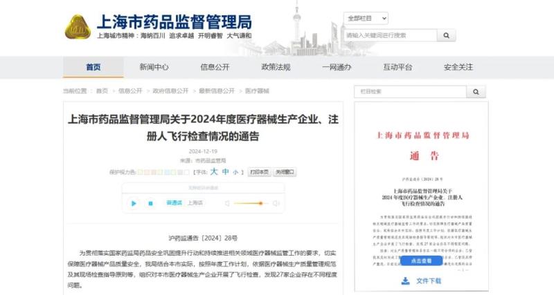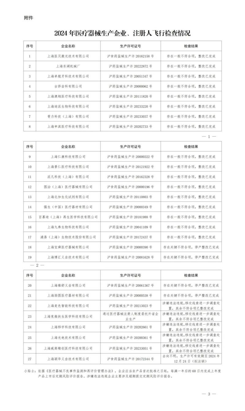 12月19日,上海市藥監(jiān)局發(fā)布《關(guān)于2024年度醫(yī)療器械生產(chǎn)企業(yè)、注冊(cè)人飛行檢查情況的通告》,其中提到,依據(jù)醫(yī)療器械生產(chǎn)質(zhì)量管理規(guī)范及其現(xiàn)場檢查指導(dǎo)原則等,該局組織對(duì)上海市醫(yī)療器械生產(chǎn)企業(yè)開展了飛行檢查,發(fā)現(xiàn)27家企業(yè)存在不同程度問題,其中17家企業(yè)存在一般不符合項(xiàng),4家企業(yè)存在關(guān)鍵不符合項(xiàng),5家企業(yè)涉嫌違法違規(guī),另有一家企業(yè)去向不明。其中有一點(diǎn)值得注意的是,涉嫌違法違規(guī)企業(yè)主要涉及超期提交定期風(fēng)險(xiǎn)評(píng)價(jià)報(bào)告。本次“飛檢”情況具體明細(xì)如下: