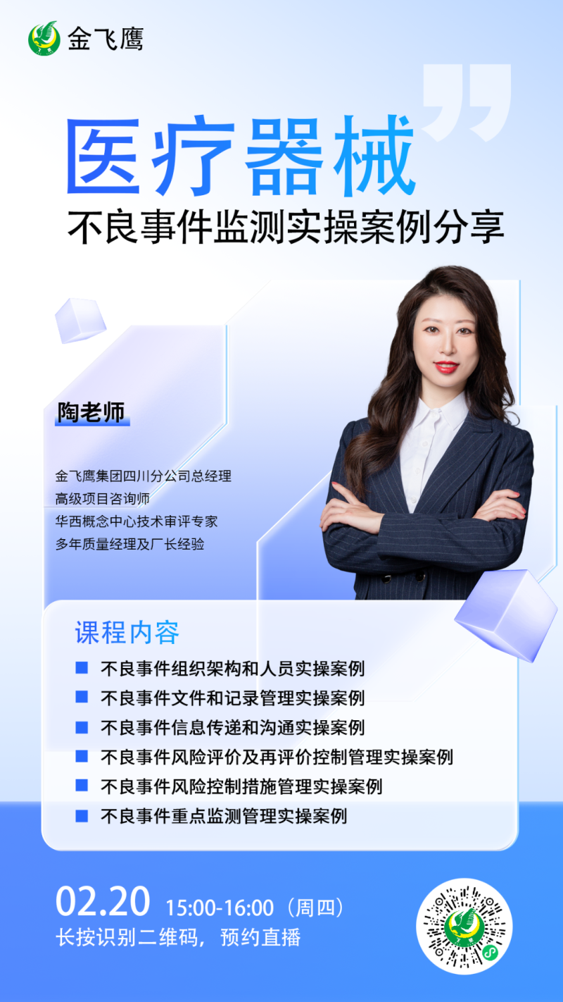 金飛鷹直播培訓(xùn)簡(jiǎn)介 金飛鷹直播培訓(xùn),是每周一次的固定培訓(xùn)欄目,優(yōu)選金飛鷹國(guó)內(nèi)外資深注冊(cè)/項(xiàng)目老師定期為大家講解醫(yī)療器械注冊(cè)相關(guān)知識(shí),解答大家在醫(yī)療器械注冊(cè)過程中的諸多疑問。 此前我們已為大家?guī)?lái)新版醫(yī)療器械生物學(xué)評(píng)價(jià)標(biāo)準(zhǔn)、新版醫(yī)療器械風(fēng)險(xiǎn)管理標(biāo)準(zhǔn)、醫(yī)療器械軟件注冊(cè)、醫(yī)療器械質(zhì)量管理體系提升技巧等共計(jì)111次線上培訓(xùn)課程,有興趣的可點(diǎn)擊視頻號(hào)直播回放進(jìn)行查看~另外大家也一定很關(guān)注接下來(lái)的培訓(xùn)主題,相關(guān)培訓(xùn)預(yù)告我們會(huì)陸續(xù)添加至視頻號(hào),請(qǐng)大家持續(xù)關(guān)注哦!