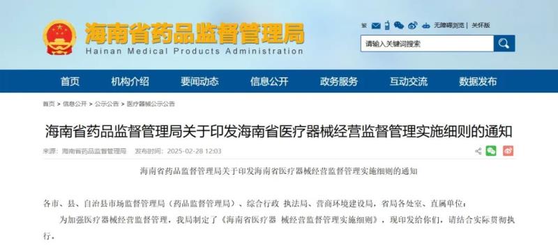 近日,海南省藥監(jiān)局發(fā)布《海南省醫(yī)療器械經(jīng)營監(jiān)督管理實(shí)施細(xì)則》(以下簡稱《細(xì)則》),并宣布自2025年3月29日起施行。
