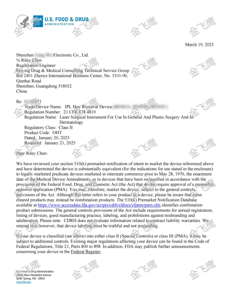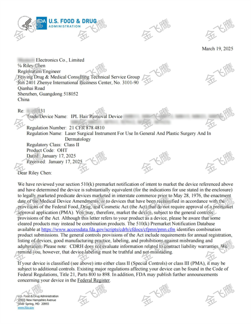 憑借我們深耕行業(yè)18年的深厚積淀與卓越的技術(shù)實(shí)力,近日金飛鷹連續(xù)輔導(dǎo)多家企業(yè)的多款產(chǎn)品獲批FDA 510(k),其中包括氣壓腿部按摩器、SGRT系統(tǒng)以及今天的主角——我們申請的首例雙脈沖脫毛儀。這一系列成功案例,不僅彰顯了我們在醫(yī)療器械注冊咨詢領(lǐng)域的專業(yè)實(shí)力和行業(yè)領(lǐng)軍地位,更為國內(nèi)醫(yī)械企業(yè)加速布局海外市場提供了堅(jiān)實(shí)的技術(shù)支持與戰(zhàn)略保障。