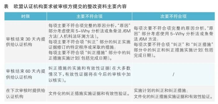 針對審核發(fā)現(xiàn)的不符合項,歐盟認證機構要求被審核方提交原因分析、糾正措施等整改資料(詳見表)。