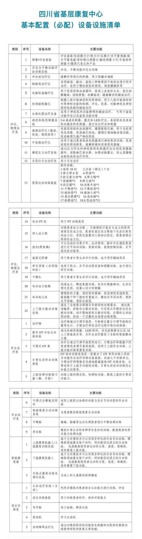 這些康復(fù)中心的建設(shè)無(wú)疑需要配置很多設(shè)備設(shè)施,其中《方案》中提到的基層康復(fù)中心必備的基本配置設(shè)備設(shè)施清單如下:
