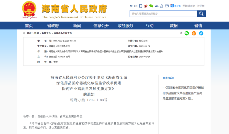 4月29日,海南省人民政府發(fā)布《海南省全面深化藥品醫(yī)療器械化妝品監(jiān)管改革促進(jìn)醫(yī)藥產(chǎn)業(yè)高質(zhì)量發(fā)展實施方案》(以下簡稱《實施方案》),立足海南自貿(mào)港封關(guān)運作重大戰(zhàn)略機遇,緊扣“強基礎(chǔ)、補短板、破瓶頸、促提升”核心目標(biāo),圍繞“目標(biāo)導(dǎo)向、精準(zhǔn)施策、特色賦能、全鏈協(xié)同”四大維度,通過系統(tǒng)化設(shè)計、精準(zhǔn)化施策,著力打造更具競爭力的產(chǎn)業(yè)發(fā)展生態(tài)。