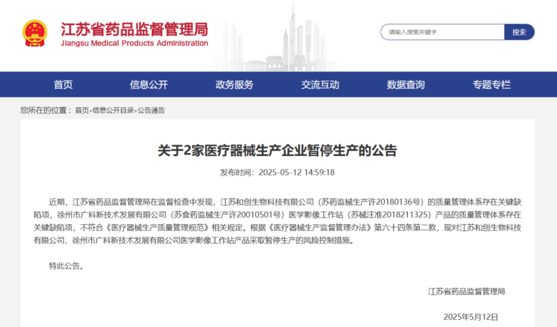 近日,江蘇省藥監(jiān)局發(fā)布公告稱,該局在監(jiān)督檢查中發(fā)現(xiàn),江蘇**生物科技有限公司(蘇藥監(jiān)械生產(chǎn)許201801**號(hào))的質(zhì)量管理體系存在關(guān)鍵缺陷項(xiàng),徐州市**新技術(shù)發(fā)展有限公司(蘇食藥監(jiān)械生產(chǎn)許200105**號(hào))醫(yī)學(xué)影像工作站(蘇械注準(zhǔn)20182113**)產(chǎn)品的質(zhì)量管理體系存在關(guān)鍵缺陷項(xiàng),不符合《醫(yī)療器械生產(chǎn)質(zhì)量管理規(guī)范》相關(guān)規(guī)定。根據(jù)《醫(yī)療器械生產(chǎn)監(jiān)督管理辦法》第六十四條第二款,現(xiàn)對(duì)江蘇**生物科技有限公司、徐州市**新技術(shù)發(fā)展有限公司醫(yī)學(xué)影像工作站產(chǎn)品采取暫停生產(chǎn)的風(fēng)險(xiǎn)控制措施。