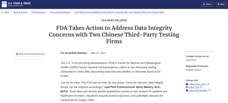 該通告提到,由于提交的檢測(cè)報(bào)告數(shù)據(jù)涉嫌偽造或被發(fā)現(xiàn)無(wú)效,CDRH向兩家中國(guó)第三方檢測(cè)公司發(fā)出了一般通信函,它們分別是位于中國(guó)天津的Mid-Link Technology Testing Co., Ltd.(Mid-Link)和位于中國(guó)蘇州的Sanitation & Environment Technology Institute of Soochow University Ltd.(SDWH) 。信中指出,由于 FDA 無(wú)法確保在以上測(cè)試機(jī)構(gòu)進(jìn)行的生物相容性測(cè)試以及動(dòng)物安全和性能測(cè)試研究的可靠性和有效性,因此該機(jī)構(gòu)將拒絕這兩家檢測(cè)機(jī)構(gòu)生成的用于上市前器械提交的數(shù)據(jù)。