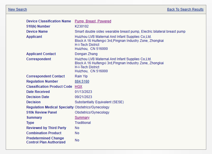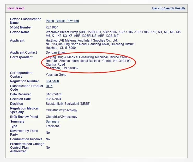我們?cè)?/span>FDA 510(k)數(shù)據(jù)庫用產(chǎn)品代碼HGX進(jìn)行檢索,近兩年來由金飛鷹申報(bào)并作為官方Correspondent的有如下企業(yè)的吸奶器產(chǎn)品: