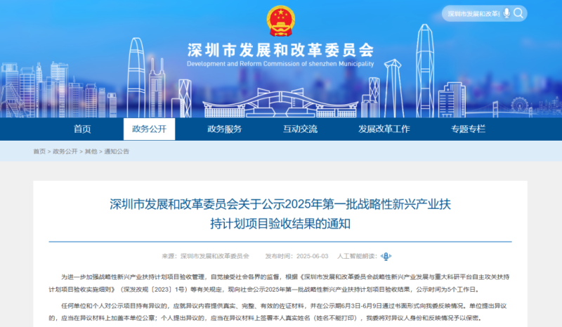 近日,深圳市發(fā)展和改革委員會公示了《2025年第一批戰(zhàn)略性新興產(chǎn)業(yè)扶持計劃項目驗收結(jié)果》,本期共有6個項目(5個通過驗收1個未通過驗收),5個通過驗收的項目中有2個為“生物醫(yī)藥”領(lǐng)域的,具體明細如下: