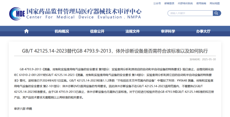 如題,根據(jù)國家藥監(jiān)局器審中心的答復(fù),GB 4793.9-2013《測量、控制和實(shí)驗(yàn)室用電氣設(shè)備的安全要求 第9部分:實(shí)驗(yàn)室用分析和其他目的自動和半自動設(shè)備的特殊要求》現(xiàn)已廢止,由等同轉(zhuǎn)化自IEC 61010-2-081:2019的GB/T 42125.14-2023《測量、控制和實(shí)驗(yàn)室用電氣設(shè)備的安全要求 第14部分:實(shí)驗(yàn)室用分析和其它目的自動和半自動設(shè)備的特殊要求》替代,該標(biāo)準(zhǔn)已于2024年4月1日起實(shí)施。