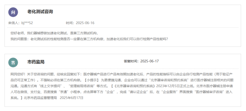 根據(jù)北京市藥監(jiān)局的答復(fù),醫(yī)療器械產(chǎn)品進行產(chǎn)品有效期加速老化后,產(chǎn)品的性能指標可以由企業(yè)自行檢測產(chǎn)品性能(用于驗證產(chǎn)品仍可正常工作)。不強制必須在第三方機構(gòu)做。